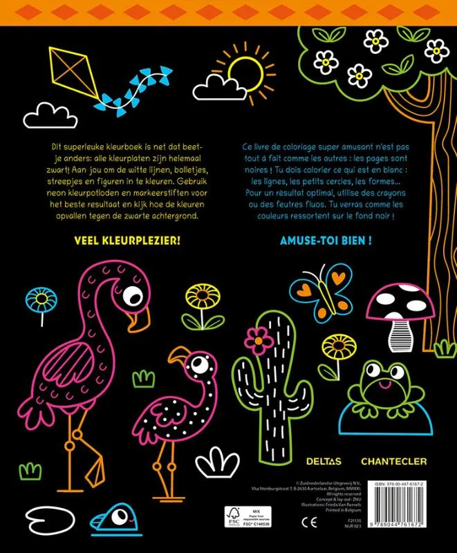 Dit superleuke kleurboek is net dat beetje anders: alle kleurplaten zijn helemaal zwart! Neem je neon of fluo kleurpotloden en markeerstiften en kleur de witte lijnen, bolletjes en streepjes in. Wat vallen de kleuren op tegen de zwarte achtergrond! Dankzij de uitscheurbare tekeningen kun je jouw kunstwerkjes ook ophangen of cadeau geven. Veel kleurplezier!
