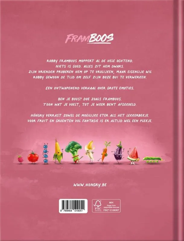 Robby Framboos moppert al de hele morgen. Niets is goed. Alles zit hem dwars. Zijn vrienden proberen hem, elk op hun manier, op te vrolijken. Terwijl Robby gewoon tijd wil om zijn boze bui zelf te verwerken. Een ontwapenend verhaal over grote emoties. Ben je boos? Doe zoals Framboos. Toon wat je voelt, Tot je weer bent afgekoeld.