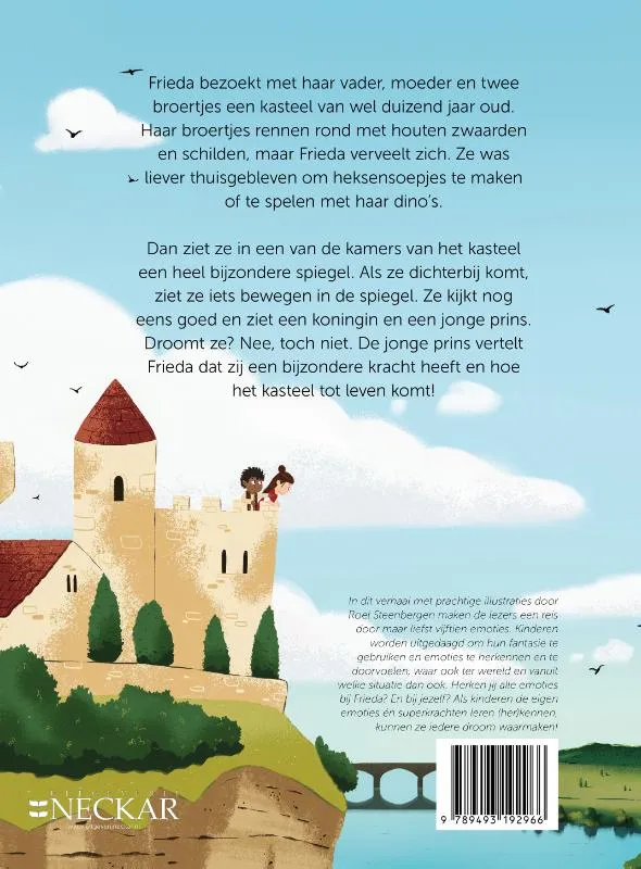 Dan ziet ze in een van de kamers van het kasteel een heel bijzondere spiegel. Als ze dichterbij komt, ziet ze iets bewegen in de spiegel. Ze kijkt nog eens goed en ziet een koningin en een jonge prins. Droomt ze? Nee, toch niet. De jonge prins vertelt Frieda dat zij een bijzondere kracht heeft en hoe het kasteel tot leven komt!