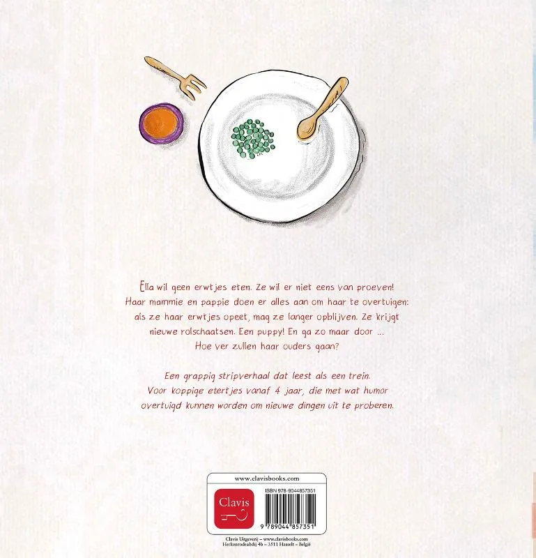Ella wil geen erwtjes eten. Ze wil er niet eens van proeven! Haar mammie en pappie doen er alles aan om haar te overtuigen: als ze haar erwtjes opeet, mag ze langer opblijven. Ze krijgt nieuwe rolschaatsen. Een puppy! En ga zo maar door … Hoe ver zullen haar ouders gaan?Een grappig stripverhaal dat leest als een trein. Voor koppige etertjes vanaf 4 jaar, die met wat humor overtuigd kunnen worden om nieuwe dingen uit te proberen.