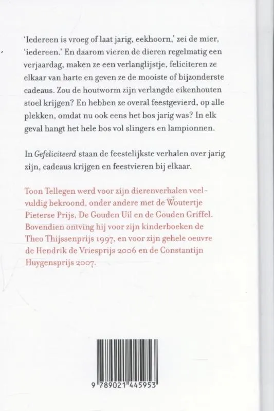 `Iedereen is vroeg of laat jarig, eekhoorn, zei de mier, `iedereen. En daarom vieren de dieren regelmatig een verjaardag, maken ze een verlanglijstje, feliciteren ze elkaar van harte en geven ze de mooiste of bijzonderste cadeaus. Zou de houtworm zijn verlangde eikenhouten stoel krijgen? En hebben ze overal feestgevierd, op alle plekken, omdat nu ook eens het bos jarig was? In elk geval hangt het hele bos vol slingers en lampionnen.