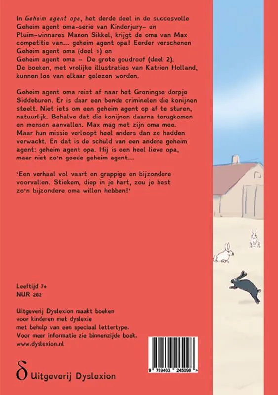 In Geheim agent opa, het derde deel in de succesvolle Geheim agent oma-serie van Kinderjury- en Pluim-winnares Manon Sikkel, krijgt de oma van Max competitie van… geheim agent opa! Eerder verschenen Geheim agent oma (deel 1) en Geheim agent oma – De grote goudroof (deel 2). De boeken, met vrolijke illustraties van Katrien Holland, kunnen los van elkaar gelezen worden. Geheim agent oma reist af naar het Groningse dorpje Siddeburen. Er is daar een bende criminelen die konijnen steelt. Niet iets om een geheim agent op af te sturen, natuurlijk. Behalve dat die konijnen daarna terugkomen en mensen aanvallen. Max mag met zijn oma mee. Maar hun missie verloopt heel anders dan ze hadden verwacht. En dat is de schuld van een andere geheim agent: geheim agent opa. Hij is een heel lieve opa, maar niet zo’n goede geheim agent… ‘Een verhaal vol vaart en grappige en bijzondere voorvallen. Stiekem, diep in je hart, zou je best zo’n bijzondere oma willen hebben!’