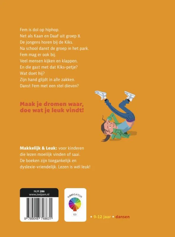 Fem danst de hele dag en is gek op hiphop. Dan mag ze meedansen met de Kiks, een hiphopgroep die na schooltijd in het park danst. Fem voelt zich geweldig, totdat haar vriendin haar vertelt dat er iets niet klopt in de groep. Danst Fem met dieven of is er iets anders aan de hand? <br>Aansprekend verhaal op laag AVI-niveau (AVI E3) voor kinderen van 9 tot 12 jaar. De serie ‘Makkelijk & Leuk’ is speciaal gemaakt voor kinderen die lezen moeilijk vinden of saai. Zo krijgen zij weer plezier in lezen. Dyslexievriendelijk!<br><br>Fem is dol op hiphop.<br>Kaan en Daaf uit groep 8 ook.<br>De jongens horen bij de Kiks. <br>Na school danst de groep in het park.<br>Fem mag er ook bij.<br>Veel mensen kijken en klappen.<br>En die gast met dat Kiks-petje?<br>Wat doet hij?<br>Zijn hand glijdt in alle zakken.<br>Danst Fem met een stel dieven?