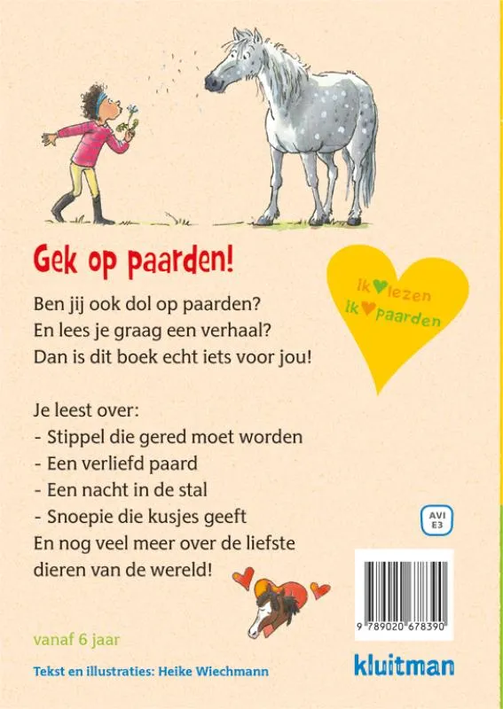 Wat wil je als beginnende lezer nog meer dan Gek op paarden!? Een prachtig boek vol lieve, leuke, spannende en ondeugende paarden en pony’s. De zeven korte verhalen zijn goed behapbaar voor elke lezer. Zo kun je af en toe een verhaaltje lezen of juist urenlang wegduiken in de wereld van paardenavonturen en dierenliefde. Alle verhalen zijn geschreven op AVI-E3niveau, en dus geschikt voor beginnende lezers om zelf te lezen, maar ze zijn ook heel leuk om voor te lezen.