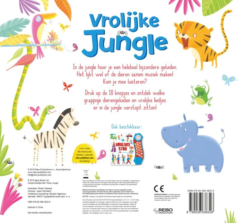 Druk op de 18 knopjes en ontdek welke grappige dierengeluiden en vrolijke liedjes er in de jungle verstopt zitten
