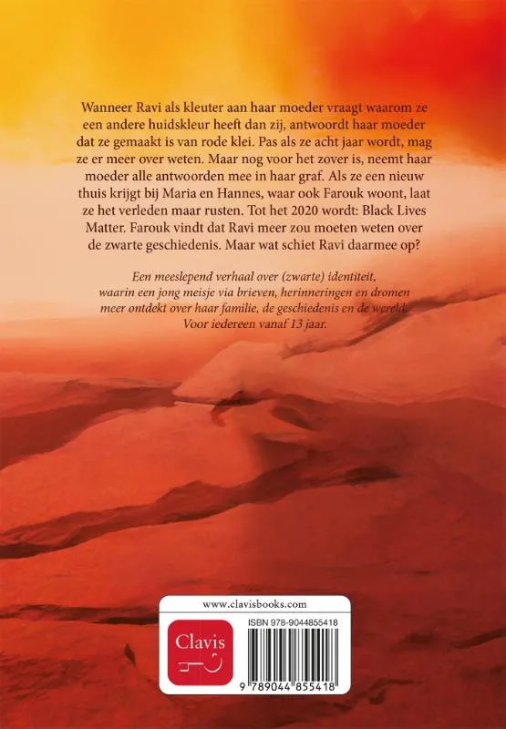 Wanneer Ravi als kleuter aan haar moeder vraagt waarom zeeen andere huidskleur heeft dan zij, antwoordt haar moederdat ze gemaakt is van rode klei. Pas als ze acht jaar wordt, magze er meer over weten. Maar nog voor het zover is, neemt haarmoeder alle antwoorden mee in haar graf. Als ze een nieuwthuis krijgt bij Maria en Hannes, waar ook Farouk woont, laatze het verleden maar rusten. Tot het 2020 wordt: Black LivesMatter. Farouk vindt dat Ravi meer zou moeten weten overde zwarte geschiedenis. Maar wat schiet Ravi daarmee op?Een meeslepend verhaal over (zwarte) identiteit,waarin een jong meisje via brieven, herinneringen en dromenmeer ontdekt over haar familie, de geschiedenis en de wereld.Voor iedereen vanaf 13 jaar.