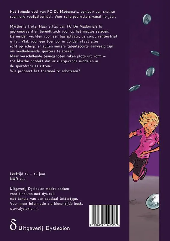 Myrthe is trots. Haar elftal van FC De Madonna’s is gepromoveerd en bereidt zich voor op het nieuwe seizoen. De meiden vechten voor een basisplaats, de concurrentiestrijd is fel. Vlak voor een toernooi in Londen staat alles écht op scherp: er zullen immers talentscouts aanwezig zijn om veelbelovende sporters te zoeken. Maar verschillende teamgenoten raken plots uit vorm – tot Myrthe ontdekt dat er rustgevende middelen in de sportdrankjes zitten.