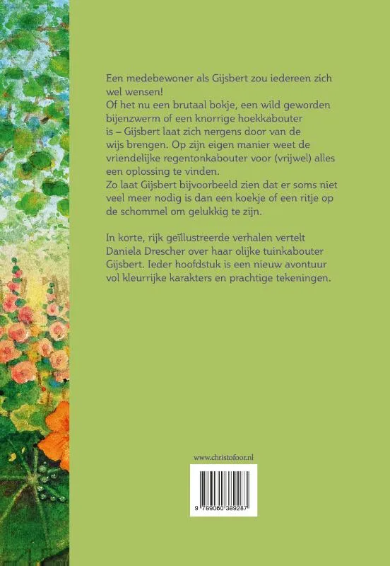 Met een bewoner als Gijsbert in je tuin is het nooit saai. De ene dag maakt hij bonje met de kat, de andere dag krijgt hij te maken met een wild geworden zwerm bijen. Om nog maar te zwijgen van die keer dat Gijsbert van de frambozenjam snoepte en vervolgens een spoor van rode plakkerige voetsporten achter zich liet. In korte, rijk geïllustreerde verhalen vertelt Daniela Drescher uit het leven van haar olijke tuinkabouter Gijsbert. Ieder hoofdstuk is een nieuw avontuur vol kleurrijke karakters en prachtige tekeningen. Heerlijk voor te lezen vanaf 5 jaar en om daarna zelf te lezen.