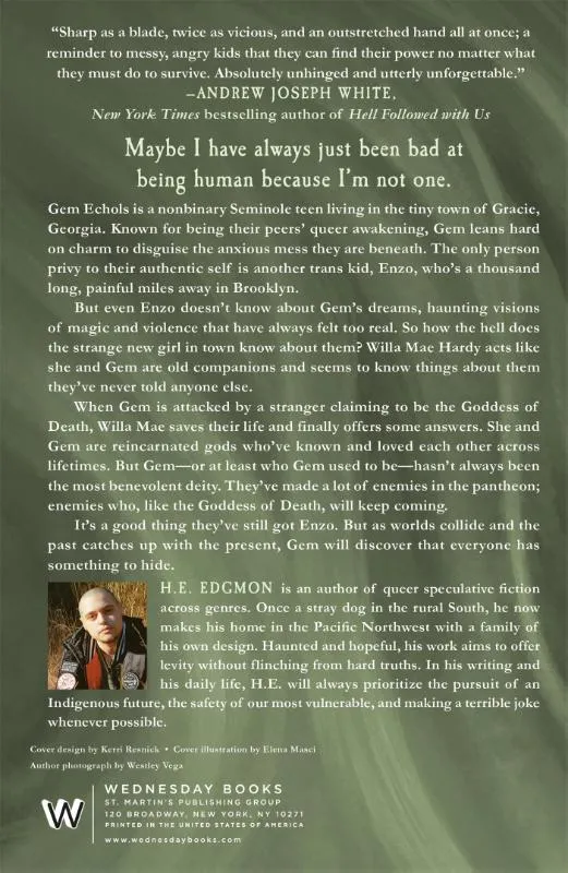 Godly Heathens is the first book in H.E. Edgmon’s YA contemporary fantasy duology The Ouroboros, in which a teen, Gem, finds out they’re a reincarnated god from another world. <br><br>Maybe I have always just been bad at being human because I’m not one.<br><br>Gem Echols is a nonbinary Seminole teen living in the tiny town of Gracie, Georgia. Known for being their peers’ queer awakening, Gem leans hard on charm to disguise the anxious mess they are beneath. The only person privy to their authentic self is another trans kid, Enzo, who’s a thousand long, painful miles away in Brooklyn.<br><br>But even Enzo doesn’t know about Gem’s dreams, haunting visions of magic and violence that have always felt too real. So how the hell does Willa Mae Hardy? The strange new girl in town acts like she and Gem are old companions, and seems to know things about them they’ve never told anyone else.<br><br>When Gem is attacked by a stranger claiming to be the Goddess of Death, Willa Mae saves their life and finally offers some answers. She and Gem are reincarnated gods who’ve known and loved each other across lifetimes. But Gem – or at least who Gem used to be – hasn’t always been the most benevolent deity. They’ve made a lot of enemies in the pantheon-enemies who, like the Goddess of Death, will keep coming.<br><br>It’s a good thing they’ve still got Enzo. But as worlds collide and the past catches up with the present, Gem will discover that everyone has something to hide.