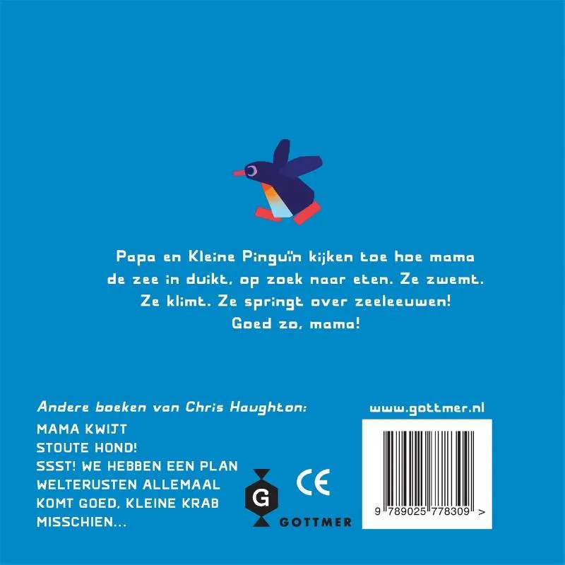 ‘Goed zo, mama!’ is terug en nu als niet te verwoesten, stevig kartonboek. Spring in het avontuur met de familie Pinguïn. Papa Pinguïn en Kleine Pinguïn kijken toe hoe mama de zee in duikt, op jacht naar eten. Mama zwemt, springt en klimt, alles om een lekker visje bij Kleine Pinguïn te krijgen. Zelfs een ontmoeting met een gevaarlijke zeeleeuw kan mama niet tegenhouden. Dit vrolijke verhaal, prachtig geïllustreerd door prentenboeksuperster Chris Haughton, is het perfecte cadeau voor Moederdag.