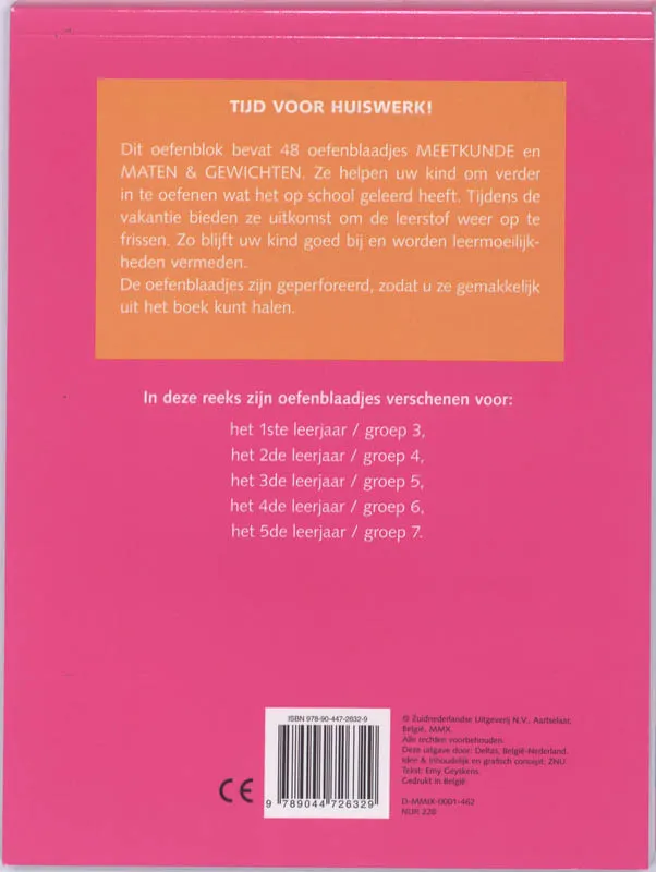 Tijd voor huiswerk Dit oefenblok bevat 48 oefenblaadjes MEETKUNDE en MATEN EN GEWICHTEN. Ze helpen uw kind om verder in te oefenen wat het op school geleerd heeft. Tijdens de vakantie bieden ze uitkomst om de leerstof weer op te frissen. Zo blijft uw kind goed bij en worden leermoeilijkheden vermeden. De oefenblaadjes zijn geperforeerd, zodat u ze gemakkelijk uit het boek kunt halen.