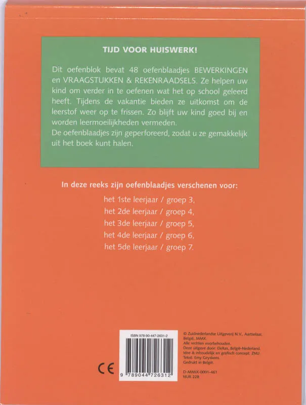 Tijd voor huiswerk Dit oefenblok bevat 48 oefenblaadjes BEWERKINGEN en VRAAGSTUKKEN EN REKENRAADSELS. Ze helpen uw kind om verder in te oefenen wat het op school geleerd heeft. Tijdens de vakantie bieden ze uitkomst om de leerstof weer op te frissen. Zo blijft uw kind goed bij en worden leermoeilijkheden vermeden. De oefenblaadjes zijn geperforeerd, zodat u ze gemakkelijk uit het boek kunt halen.