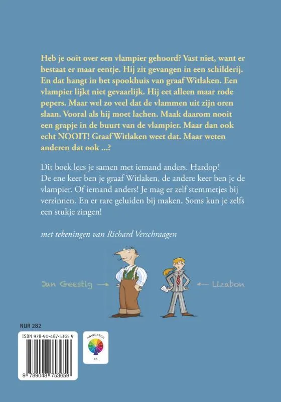 Heb je ooit over een vlampier gehoord? Vast niet, want er bestaat er maar eentje. Hij zit gevangen in een schilderij. En dat hangt in het spookhuis van Graaf Witlaken.<br>Een vlampier lijkt niet zo gevaarlijk. Hij drinkt geen bloed en hij bijt geen mensen. Hij eet alleen maar rode pepers. En wel zo veel, dat de vlammen soms uit zijn oren slaan. Vooral als hij moet lachen. Dan schieten er steekvlammen uit zijn hoofd die alles verwoesten. Maak daarom nooit een grapje in de buurt van de vlampier. Maar dan ook echt NOOIT! Elk lolletje is bij hem bloedlink …<br>Graaf Witlaken weet dat. Maar weten de mensen die naar zijn spookhuis komen dat ook?<br><br>Altijd al in een toneelstuk willen spelen? Met een toneelleesboek lijkt het net of je in een voorstelling zit. Personages klaar? Stemmen gesmeerd? Lees hard, zacht, boos of blij. Wat jij vindt passen bij jouw rol. Luister naar je leesmaatje, oefen je intonatie en leer omgaan met leestekens in dit geestige toneelleesboek op AVI E5-niveau. Van schrijver Ferry Piekart en illustrator Richard Verschraagen, die eerder ook samenwerkten aan het toneellezen moppenboek De moppen van Graaf Witlaken.