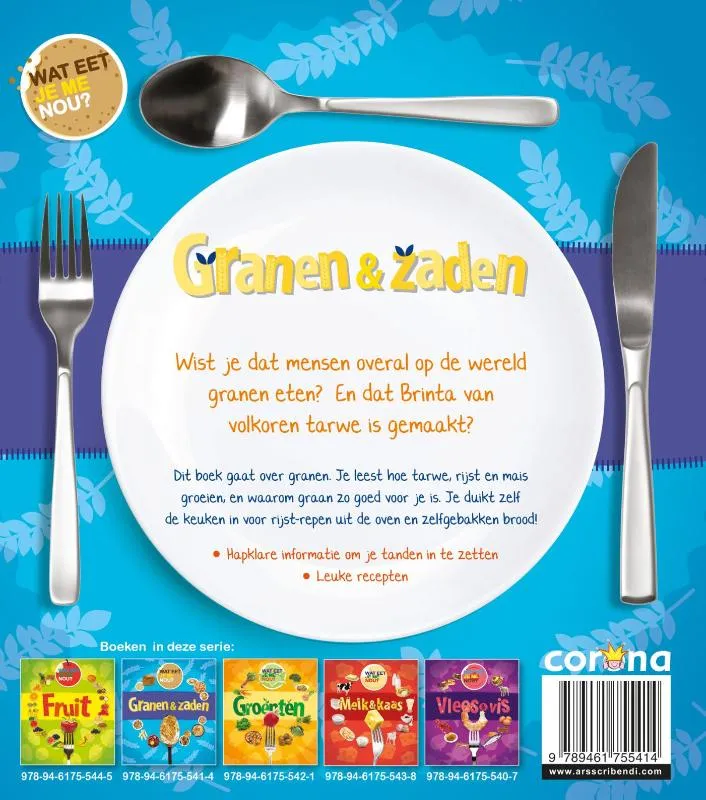 Wist je dat mensen overal op de wereld granen eten? En dat Brinta van volkoren tarwe is gemaakt? Dit boek gaat over granen. Je leest hoe tarwe, rijst en mais groeien, en waarom graan zo goed voor je is. Je duikt zelf de keuken in voor rijst-repen uit de oven en zelfgebakken brood!