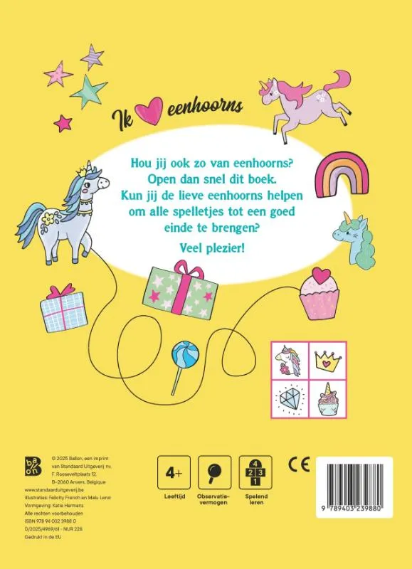 Hou jij ook zo van eenhoorns? Open dan snel dit boek. Kun jij de lieve eenhoorns helpen om alle spelletjes tot een goed einde te brengen? Veel plezier!