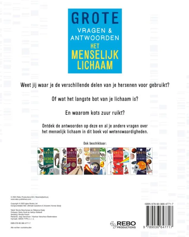 Leerzaam en toegankelijk boek voor kinderen om van alles te weten te komen over het menselijk lichaam, boordevol interessante vragen en antwoorden, en duidelijke illustraties en foto’s.