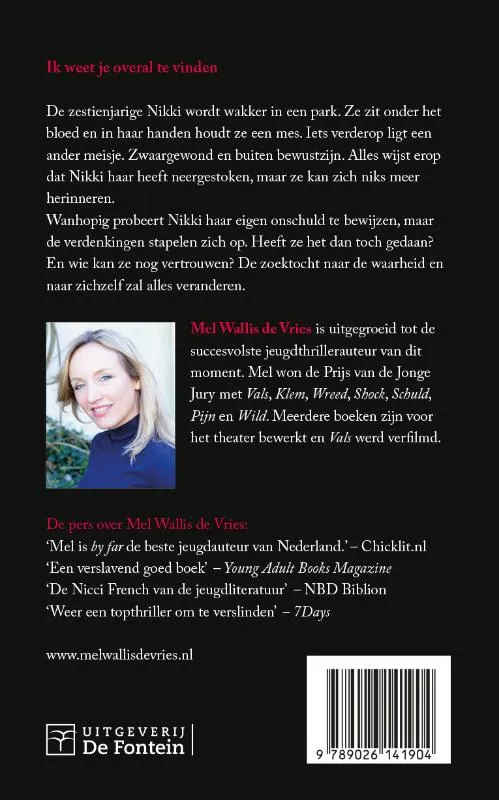 Nikki wordt wakker in een park, onder het bloed en… met een mes in haar handen. Verderop ligt een zwaargewond meisje. Nikki heeft geen idee wie ze is. Jeugdthriller van zevenvoudig Jonge Jury-winnares