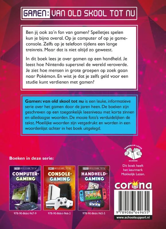 Weetjes over de geschiedenis van handheld computers zoals Game Boy en de spelletjes die je ook op je mobiele telefoon kan spelen. Van Auto Race uit 1976 en Gran Turismo tot Mario Kart. Met kleurenfoto’s en -illustraties. MLP. Vanaf ca. 9 t/m 11 jaar.