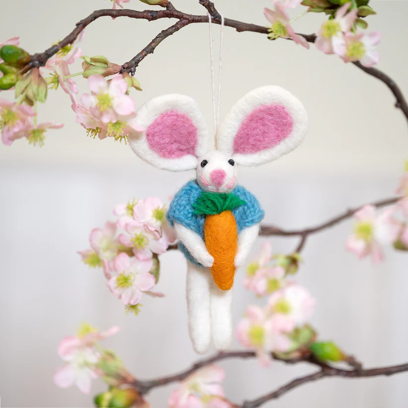 Haasje van vilt met een turquoise truitje aan. Ze houden een worteltje vast. Het haasjes is voorzien van een hanger. Te gebruiken als decoratie. Ook leuk om in een paastak te hangen, ideaal om door de kinderen te laten doen, want ze kunnen niet kapot vallen!