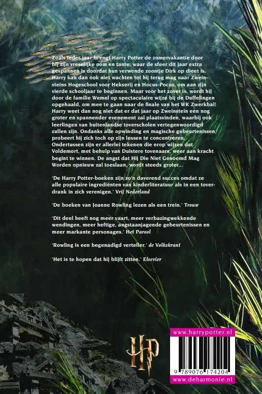 Zoals ieder jaar brengt Harry Potter de zomervakantie door bij zijn vreselijke oom en tante, waar de sfeer dit jaar extra gespannen is door dat hun verwende zoontje Dirk op dieet is. Harry kan dan ook niet wachten tot hij terug mag naar Zweinsteins Hogeschool voor Hekserij en Hocus-Pocus, om aan zijn vierde schooljaar te beginnen. Maar voor het zover is, wordt hij door de familie Wemel op spectaculaire wijze bij de Duffelingen opgehaald, om mee te gaan naar de fi nale van het WK Zwerkbal!Harry weet dan nog niet dat er dat jaar op Zweinstein een nog groter en spannender eve ne ment zal plaatsvinden, waarbij ook leerlingen van buitenlandse toverscholen vertegenwoordigd zullen zijn. Ondanks alle opwinding en magische gebeurtenissen, probeert hij zich toch op zijn lessen te concentreren.Ondertussen zijn er allerlei tekenen die erop wijzen dat Voldemort, met behulp van Duistere tovenaars, weer aan kracht begint te winnen. De angst dat Hij Die Niet Genoemd Mag Worden opnieuw zal toeslaan, wordt steeds groter… ‘De Harry Potter-boeken zijn zo’n daverend succes omdat ze alle populaire ingrediënten van kinderliteratuur als in een toverdrank in zich verenigen.’ Vrij Nederland‘De boeken van Joanne Rowling lezen als een trein.’ Trouw‘Dit deel heeft nog meer vaart, meer verbazingwekkende wendingen, meer heftige, angstaanjagende gebeurtenissen en meer markante personages.’ Het Parool‘Rowling is een begenadigd verteller.’ de Volkskrant‘Het is te hopen dat hij blijft zitten.’ Elsevier