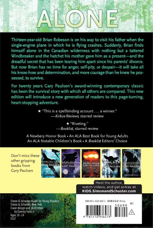 Paulsens Newbery Honor Book tells the story of 13-year-old Brian Robeson, the sole survivor of a plane crash in the Canadian wilderness. This 20th anniversary commemorative edition features a fresh new look and a new reading group guide, along with new content from the author. Illustrations.<br>