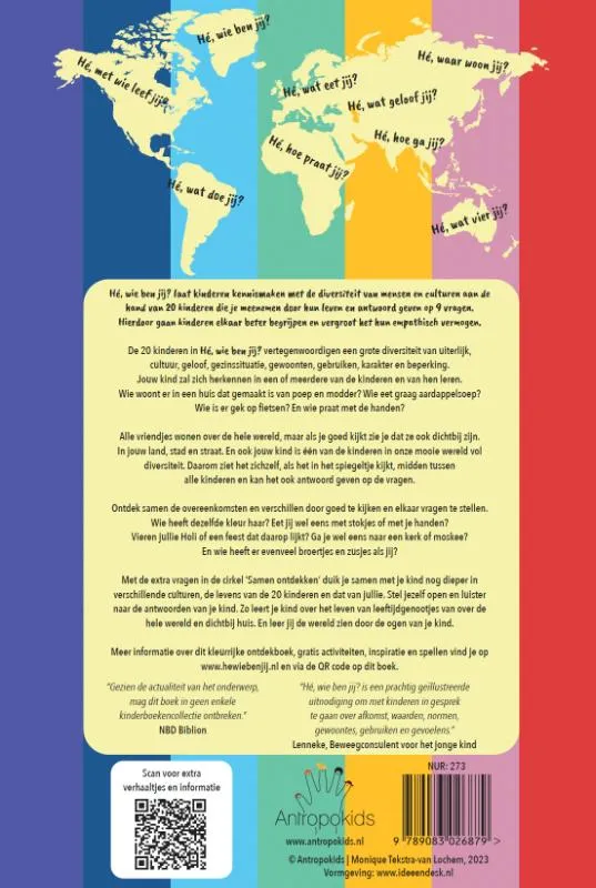Hé, wie ben jij? laat kinderen kennismaken met de diversiteit mensen en culturen aan de hand 20 kinderen die je meenemen door hun leven en antwoord geven op 9 vragen.
