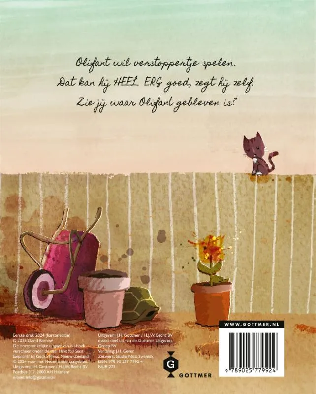 In dit stevige kartonboekje van de prentenboekklassieker ‘Heb jij misschien Olifant gezien?’ speelt een jongetje verstoppertje met een olifant. Het jongetje telt tot tien en de olifant gaat zich verstoppen. Dat kan hij HEEL ERG goed, waarschuwt hij nog – en hij krijgt gelijk! Hoewel de lezer hem duidelijk kan zien zitten, staart het jongetje steeds weer verbaasd in het rond. Waar kan Olifant toch gebleven zijn? Zelfs zijn vader en moeder kijken er zo overheen!<br>’Heb jij misschien Olifant gezien?’ is het eerste prentenboek van David Barrow, die in 2015 als meest veelbelovende kinderboekenillustrator van Groot-Brittannië de Sebastian Walker Award kreeg. Het komische verhaal en de prachtige waterverfprenten maken dit boek een genot om keer op keer voor te lezen aan kinderen vanaf 4 jaar. In 2018 werd het boek bekroond met een Zilveren Penseel, en in datzelfde jaar stond het ook in de Prentenboek Top Tien.