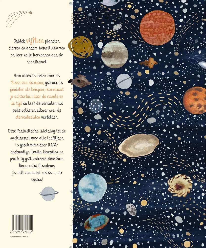 Alle hemelverschijnselen die in dit boek worden beschreven, zijn op een donkere nacht vanuit je achtertuin (of park, balkon of camping) te zien. Van de zon en de maan tot Venus en Mars, satellieten, de Grote Beer, de Melkweg en veel meer. Leer de maanfasen herkennen en je richting te bepalen aan de hand van de Poolster, en ontdek hoe je vanuit je slaapkamer door de ruimte en de tijd kunt reizen. Dit boek onthult hoe de mensheid is verweven met de sterrenbeelden die oplichten aan de hemel. De schrijfster werkt voor NASA, dus als iemand weet waar ze het over heeft, is zij het wel. Haar fijne uitleg en anekdotes zijn van prachtige, sfeervolle beelden voorzien door Sara Boccaccini Meadows, die eerder het schitterende Plant illustreerde.