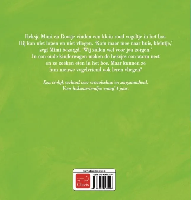 Heksje Mimi en Roosje vinden een klein rood vogeltje in het bos. Hij kan niet lopen en niet vliegen. ‘Kom maar mee naar huis, kleintje,’ zegt Mimi bezorgd. ‘Wij zullen wel voor jou zorgen.’ In een oude kinderwagen maken de heksjes een warm nest en ze zoeken eten in het bos. Maar kunnen ze hun nieuwe vogelvriend ook leren vliegen?
