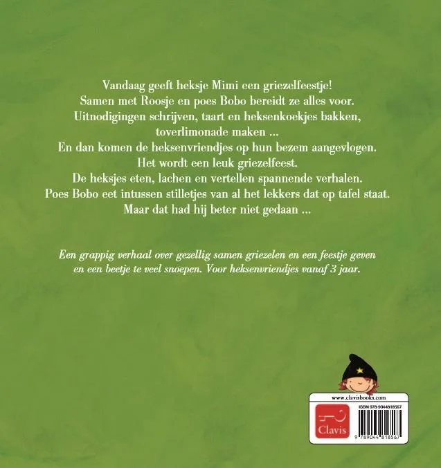 Vandaag geeft heksje Mimi een griezelfeestje! Samen met Roosje en poes Bobo bereidt ze alles voor. Uitnodigingen schrijven, taart en heksenkoekjes bakken, toverlimonade maken … En dan komen de heksenvriendjes op hun bezem aangevlogen. Het wordt een leuk griezelfeest. De heksjes eten, lachen en vertellen spannende verhalen. Poes Bobo eet intussen stilletjes van al het lekkers dat op tafel staat. Maar dat had hij beter niet gedaan …