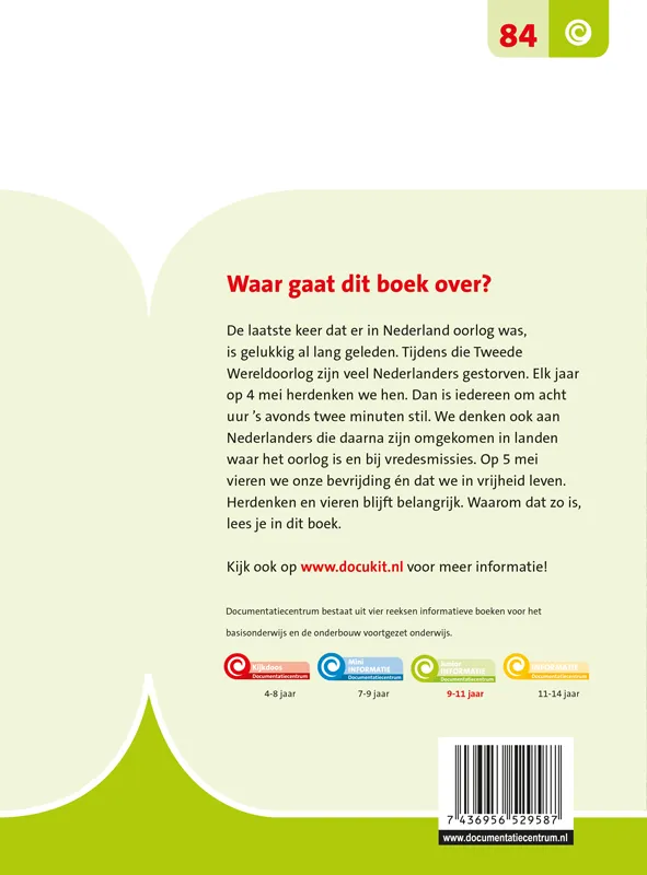 De laatste keer dat er in Nederland oorlog was, is gelukkig al lang geleden. Tijdens die Tweede Wereldoorlog zijn veel Nederlanders gestorven. Elk jaar op 4 mei herdenken we hen. Dan is iedereen om acht uur ’s avonds twee minuten stil. We denken ook aan Nederlanders die daarna zijn omgekomen in landen waar het oorlog is en bij vredesmissies. Op 5 mei vieren we onze bevrijding én dat we in vrijheid leven. Herdenken en vieren blijft belangrijk. Waarom dat zo is, lees je in dit boek.