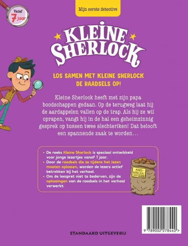 Maak kennis met kleine Sherlock en zijn vrienden. Kleine Sherlock is 7 jaar, en zijn papa is de grote Sherlock Holmes. Mysteries oplossen zit hem dus in het bloed. En zoals elke goede detective, komt hij natuurlijk nooit buiten zonder zijn vergrootglas. Als Kleine Sherlock terugkomt van de winkel, laat hij de zak aardappelen vallen in de traphal van het flatgebouw waar hij woont. Terwijl hij opruimt, vangt hij flarden op van een mysterieus gesprek. En dan ziet hij voetsporen bij een deur die al heel lang op slot is… Wie of wat kan hierachter zitten? Samen met zijn vrienden en zijn hond, lost Kleine Sherlock in elk boek een raadsel op, en hij neemt jou, als lezer, mee op sleeptouw. Elke verhaal bevat zeven raadsels die je samen met de hoofdpersonages mag ontcijferen. Slagen jullie erin om de schuldige te vinden?