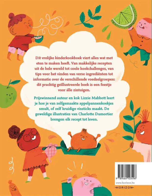 Dit vrolijke kinderkookboek viert alles wat met eten te maken heeft. Van makkelijke recepten uit de hele wereld tot coole kookchallenges, van tips voor het vinden van verse ingrediënten tot informatie over de verschillende voedselgroepen: dit prachtig geïllustreerde (kook)boek is een feestje voor álle zintuigen.<br>Prijswinnend auteur en kok Lizzie Mabbott leert je hoe je van zelfgemaakte appelpannenkoekjes smult, of zelf kruidige vissticks maakt. De geweldige illustraties van Charlotte Dumortier brengen elk recept tot leven.