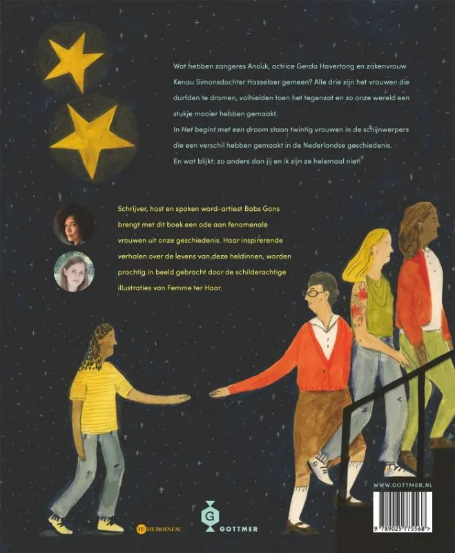 Schrijver, host en spoken word-artiest Babs Gons brengt met ‘Het begint met een droom’ een ode aan fenomenale vrouwen uit onze geschiedenis. In dit inspirerende, informatieve boek vertelt ze op een toegankelijke manier over de levens van deze heldinnen. Femme ter Haar maakte de schilderachtige illustraties waarin onder meer Wilhelmina Drucker, Khadija Arib en Nikkie de Jager van de pagina’s spatten.