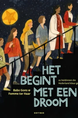 Schrijver, host en spoken word-artiest Babs Gons brengt met ‘Het begint met een droom’ een ode aan fenomenale vrouwen uit onze geschiedenis. In dit inspirerende, informatieve boek vertelt ze op een toegankelijke manier over de levens van deze heldinnen. Femme ter Haar maakte de schilderachtige illustraties waarin onder meer Wilhelmina Drucker, Khadija Arib en Nikkie de Jager van de pagina’s spatten.