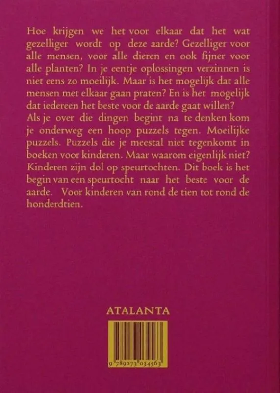Als je over die dingen begint na te denken kom je onderweg een hoop puzzels tegen. Moeilijke puzzels. Puzzels die je meestal niet tegenkomt in boeken voor kinderen. Maar waarom eigenlijk niet? Kinderen zijn dol op speurtochten. Dit boek is het begin van een speurtocht naar het beste voor de aarde. Voor kinderen van rond de tien tot rond de honderdtien.