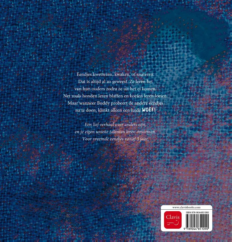Eendjes kwetteren, kwaken, of snateren. Dat is altijd al zo geweest. Ze leren het van hun ouders zodra ze uit het ei komen. Net zoals honden leren blaffen en koeien leren loeien. Maar wanneer Buddy probeert de andere eendjes na te doen, klinkt alleen een luide WOEF! Een lief verhaal over anders zijn, en je eigen unieke talenten leren omarmen. Voor vreemde eendjes vanaf 3 jaar.