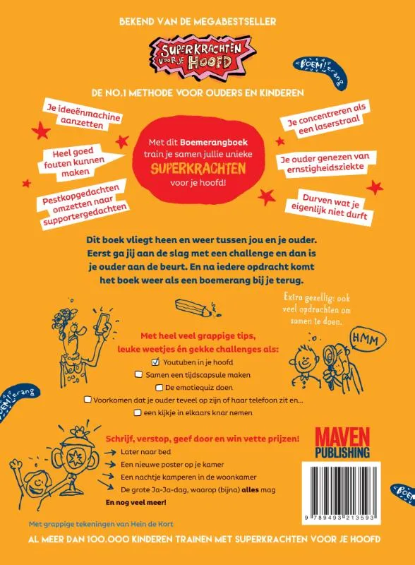 Dankzij de luchtige en relativerende schrijfstijl en de grappige tekeningen van Hein de Kort is het trainen van mentale weerbaarheid voor ouder en kind nog nooit zo leuk geweest. Ontdek je laserstraal van aandacht, leer te durven wat je eigenlijk niet durft en maak samen een tijdcapsule die je pas opent als je kind 18 jaar is, en nog heel veel meer.