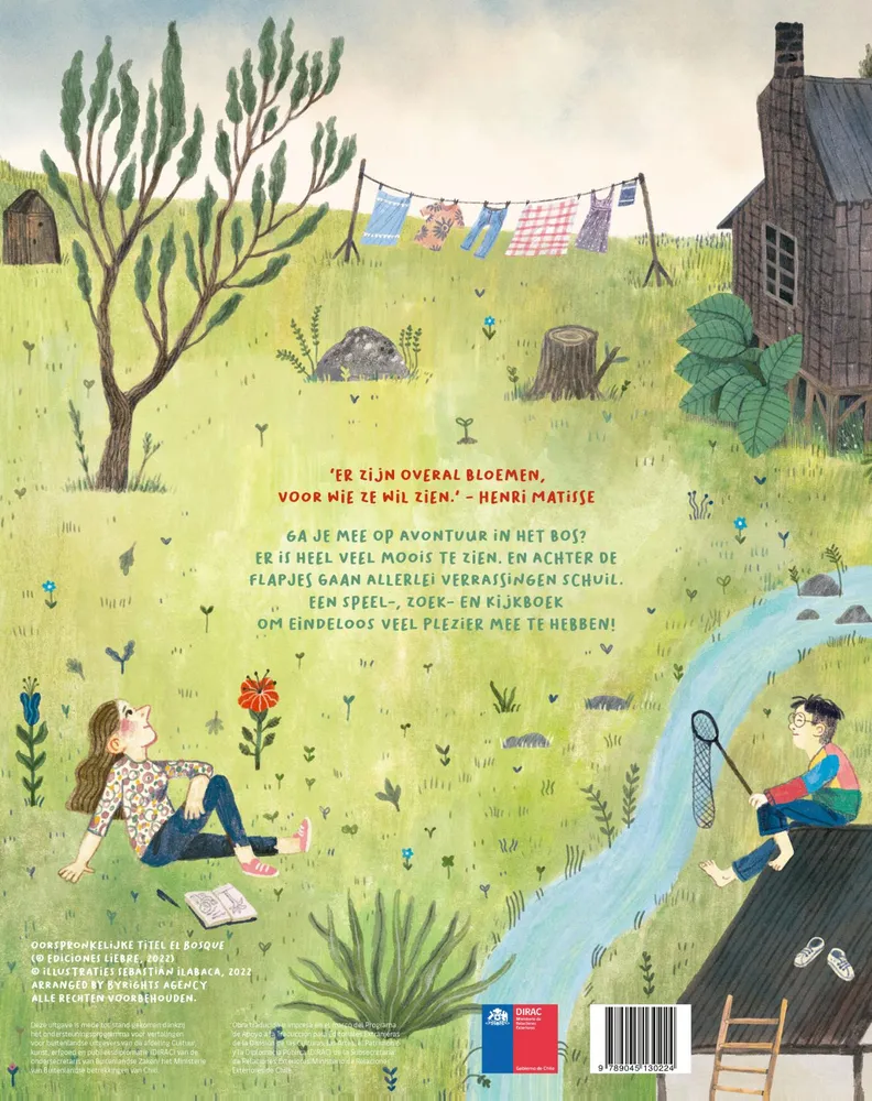 Dit tekstloze uitklapboek is meer dan 3 meter lang. Je kunt het rechtop zetten op de vloer en je helemaal omringen met dit prachtige bos. Aan de ene kant zie je een bos vol dieren die van alles beleven en aan de andere kant wordt het bos bewoond door mensen. Je kijkt er je ogen uit, zoveel bijzonders is er te zien. En achter de flapjes gaan nog meer verrassingen schuil.