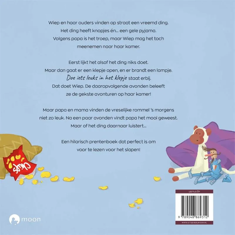 Wiep en haar ouders vinden op straat een vreemd ding. Het ding heeft knopjes én… een gele pyjama. Volgens papa is het troep, maar Wiep mag het toch meenemen naar haar kamer.<br>Eerst lijkt het alsof het ding niks doet. Maar dan gaat er een klepje open, en er brandt een lampje. Doe iets leuks in het klepje staat erbij. Dat doet Wiep. De daaropvolgende avonden beleeft ze de gekste avonturen op haar kamer!<br>Maar papa en mama vinden de vreselijke rommel ’s morgens niet zo leuk. Na een paar avonden vindt papa het mooi geweest. Maar of het ding daarnaar luistert…