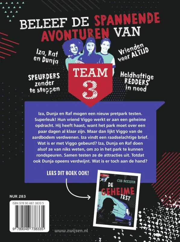 Spannende detectiveserie Team 3 van thrillerauteur Cis Meijer voor kinderen vanaf 9 jaar. Dit is het tweede boek uit de serie. Beleef alle avonturen van Raf, Dunja en Iza. In