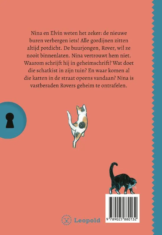 Nina en Elvin weten het zeker: de nieuwe buren verbergen iets! Alle gordijnen zitten altijd potdicht. De buurjongen, Rover, wil ze nooit binnenlaten. Nina vertrouwt hem niet. Waarom schrijft hij in geheimschrift? Wat doet die schatkist in zijn tuin? En waar komen al die katten in de straat opeens vandaan? Nina is vastberaden Rovers geheim te ontrafelen.