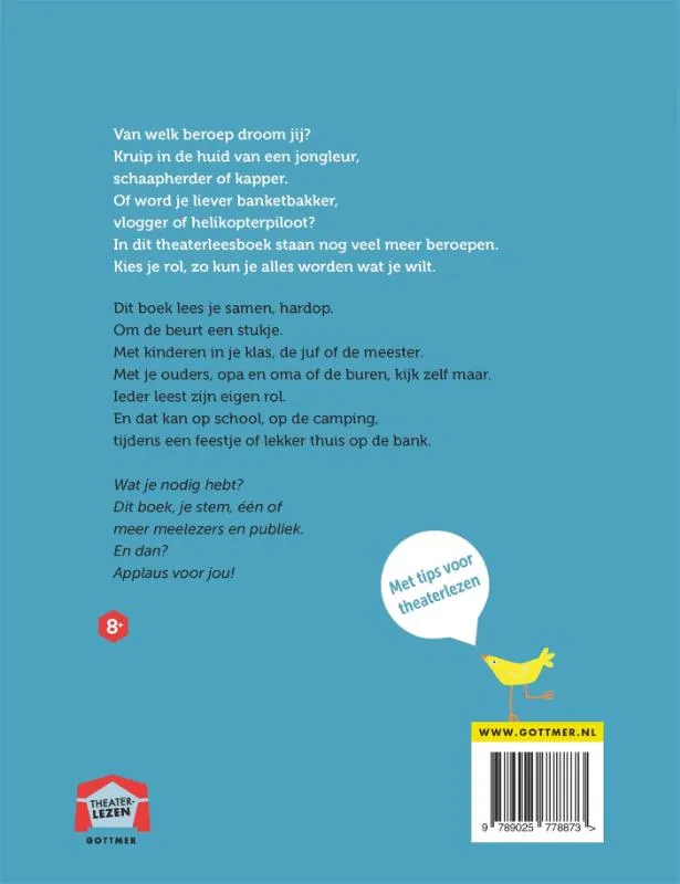 Kies een verhaal of een mop en lees dit boek samen met anderen, hardop. Neem om de beurt een stukje voor je rekening en beleef samen met je klasgenoten, juf of meester, ouders, grootouders of zelfs je buren een onvergetelijke theaterleeservaring. Of je nu op school, de camping, een feestje of gewoon gezellig thuis op de bank zit. Het enige wat je nodig hebt, is dit boek van Theaterlezen, je stem, één of meer leesgenoten en een enthousiast publiek. En wat krijg je dan? Een welverdiend applaus! Met leuke weetjes over beroepen en tips voor theaterlezen. Geschikt voor lezers vanaf 8 jaar.