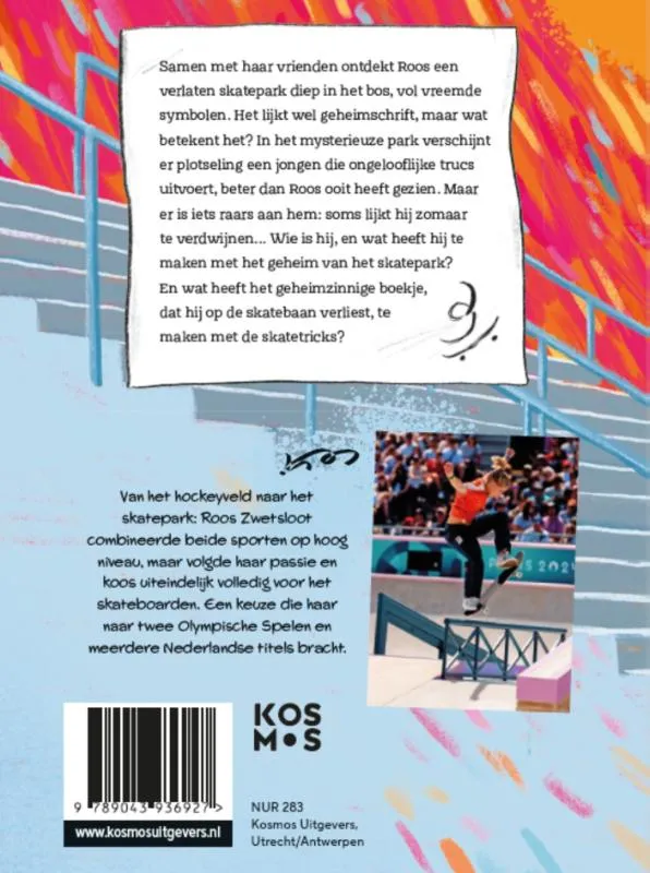 Roos en haar vrienden ontdekken een geheim skatepark en een mysterieuze skater. Een spannend en grappig boek voor 9+ van Olympisch skateboarder Roos Zwetsloot, met illustraties van Sophie Pluim.