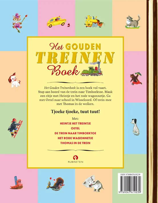 Het Gouden Treinenboek is een boek vol vaart. Stap aan boord van de trein naar Timboektoe. Maak een ritje met Heintje en het rode wagonnetje. Ga met Oetel naar school in Wisseloord. Of trein mee met Thomas, Bas en Jolijn. Tjoeke tjoeke, tuut tuut!
