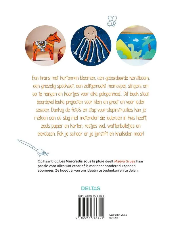 Wat is er leuker dan op een regenachtige dag thuis gezellig met je kinderen te knutselen? Dit boek staat boordevol leuke en originele projecten voor klein en groot, en voor ieder seizoen. Dankzij mooie foto’s en stap-voor-stapinstructies kan je aan de slag met materialen die iedereen in huis heeft, zoals papier en karton, restjes wol, wattenbolletjes en eierdozen. Een krans met kartonnen bloemen, een geborduurde kerstboom, een griezelig spookslot, een zelfgemaakt memospel, slingers om op te hangen en kaartjes voor elke gelegenheid. Pak je schaar en je lijmstift en knutselen maar! Op haar blog Les Mercredis sous la pluie deelt Maéva Gruaz haar passie voor alles wat creatief is met haar honderdduizenden abonnees. Ze houdt ervan om ideeën te bedenken en te delen.