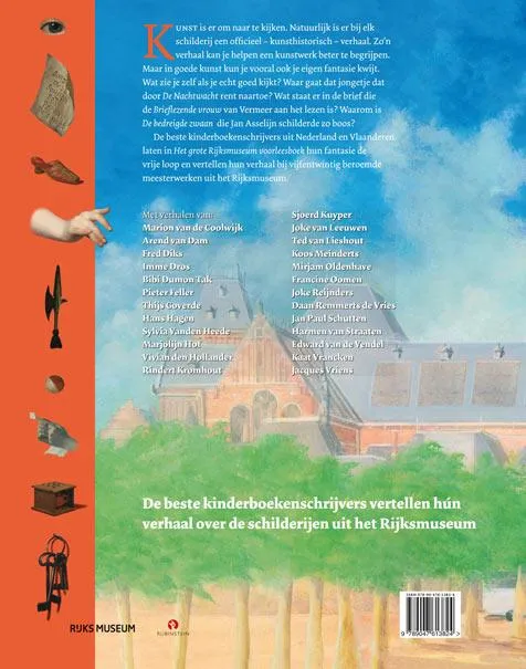 Kunst is er om naar te kijken. Natuurlijk is er bij elk schilderij een officieel – kunsthistorisch – verhaal. Zo’n verhaal kan je helpen een kunstwerk beter te begrijpen. Maar in goede kunst kun je vooral ook je eigen fantasie kwijt. Wat zie je zelf als je echt goed kijkt? Waar gaat dat jongetje dat door De Nachtwacht rent naartoe? Wat staat er in de brief die de Brieflezende vrouw van Vermeer aan het lezen is? Waarom is De bedreigde zwaan die Jan Asselijn schilderde zo boos? De beste kinderboekenschrijvers uit Nederland en Vlaanderen laten in Het grote Rijksmuseum voorleesboek hun fantasie de vrije loop en vertellen hun verhaal bij vijfentwintig beroemde meesterwerken uit het Rijksmuseum.