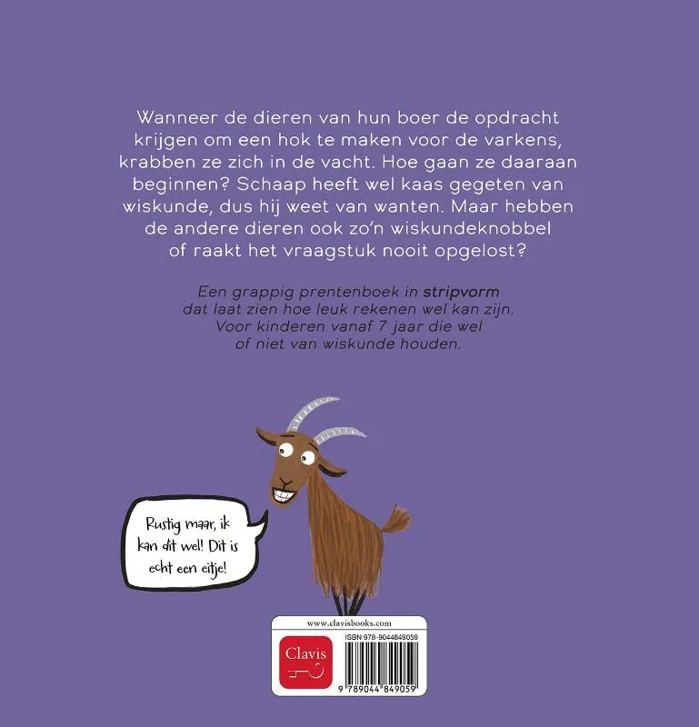Komische strip met een eenvoudige berekening voor oppervlakte van een rechthoek centraal. Vanaf ca. 5 jaar.