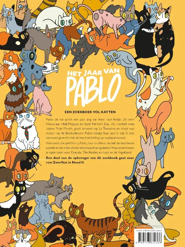 Pablo de kat sprint een jaar lang van feest naar festijn. Ze viert Nieuwjaar, Holi-Phagwa en Saint Patrick’s Day. Ze kronkelt mee tijdens Pride Month, gooit tomaten op La Tomatina en shopt wat lectuur op de Boekenbeurs. Pablo eindigt haar jaar in stijl: in een verwoed gevecht met de kerstverlichting op oudejaarsavond.