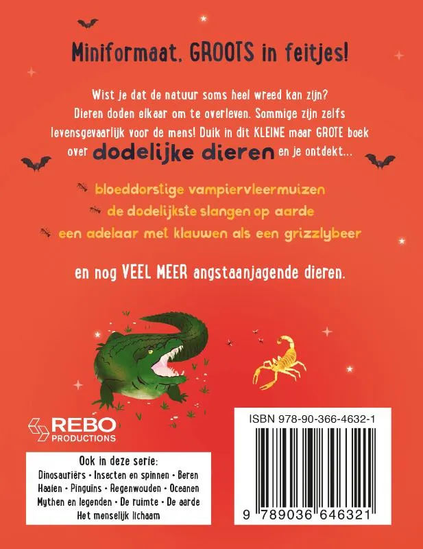 Wist je dat de natuur soms heel wreed kan zijn? Dieren doden elkaar om te overleven. Sommige zijn zelfs levensgevaarlijk voor de mens! Duik in dit kleine maar grote boek over dodelijke dieren en je ontdekt bloeddorstige vampiervleermuizen, de dodelijkste slangen op aarde, een adelaar met klauwen als een grizzlybeer en nog veel meer angstaanjagende dieren.